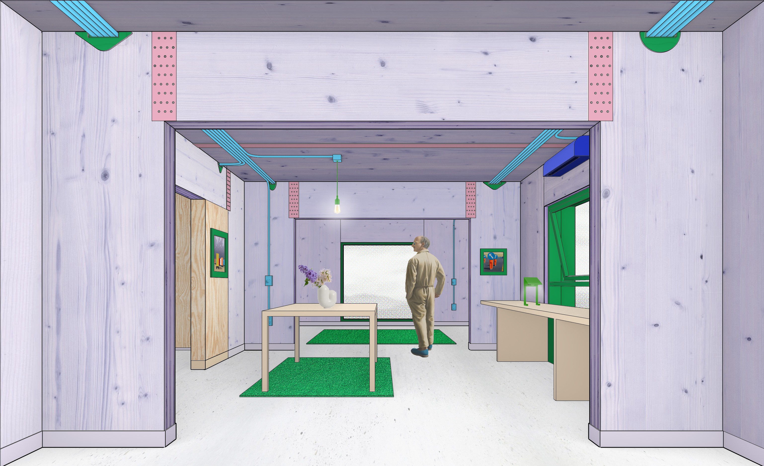 Though Shagworks is made of timber, its material character is colorful, texturally rich, and graphic. CLT panels are stained green and purple for a distinctive interior – wood texture, but psychedelic color. The building’s ornaments are the realities of construction, plus some paint. Shagworks produces unique atmospheres within an efficient and affordable system.