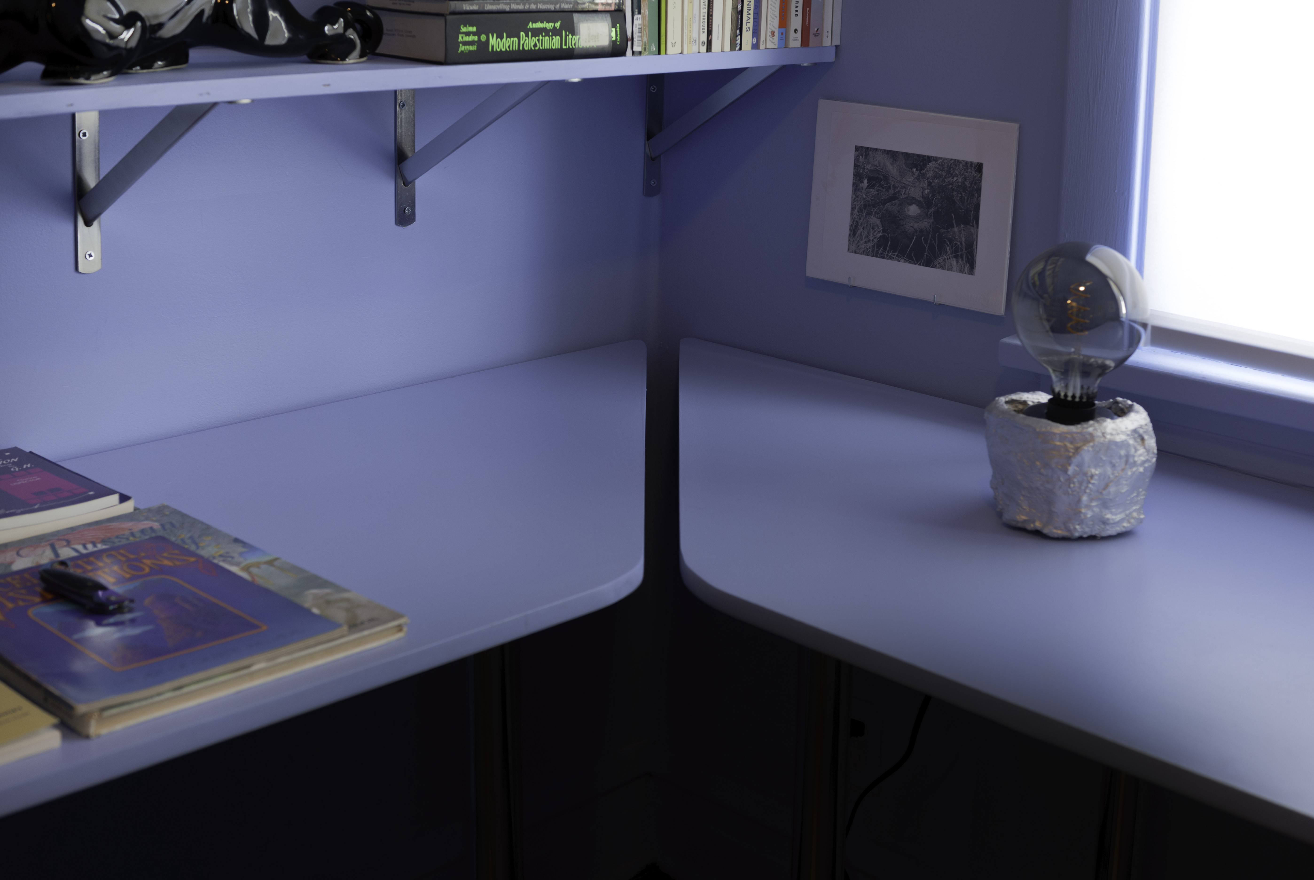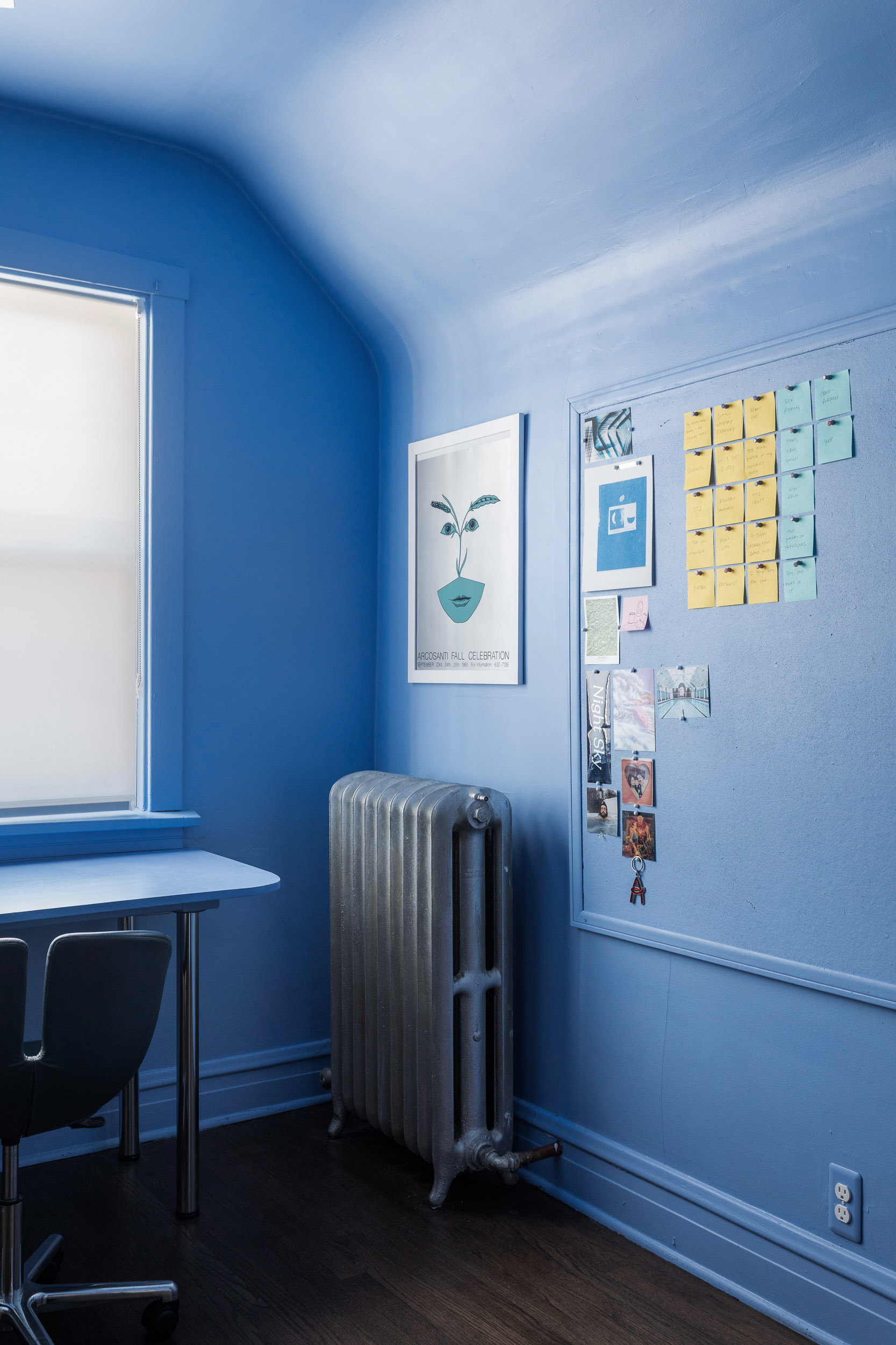 One L2 bedroom is converted into the Writer’s Studio. Here, one of the residents – a fiction writer and teacher – works overlooking the street in the morning sunlight. The walls and furniture (including a custom desk designed and built by Orders) are all painted a rich blue, simultaneously calming and stimulating.