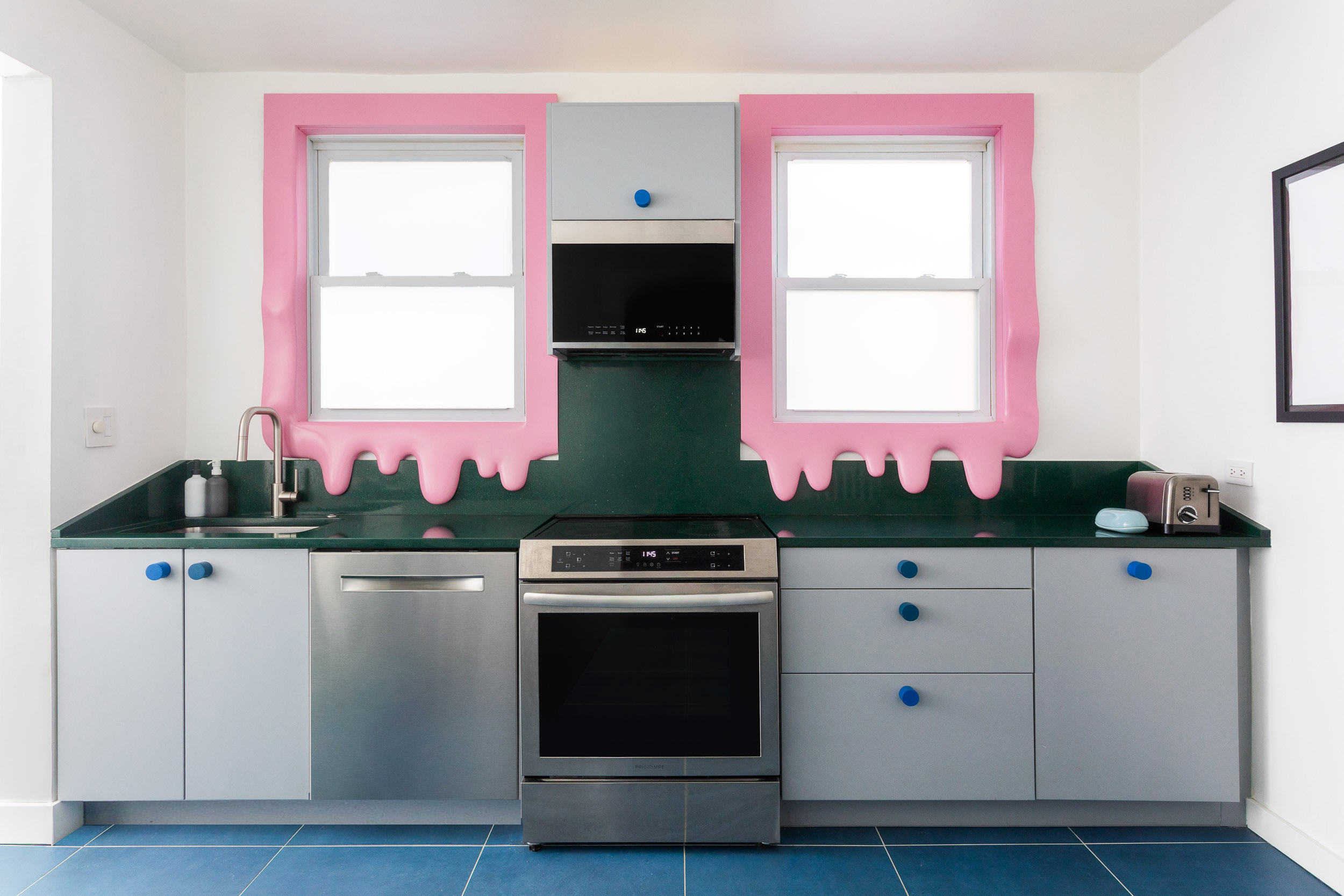 The renovation also smuggles art historical reference into an iconic Chicago housing type. In dialogue with works by Chicago Imagist painters, window millwork drips, color palettes veer from the norm, pattern enlivens – all portals into a different sensibility for an old house. Custom furniture is an accomplice.