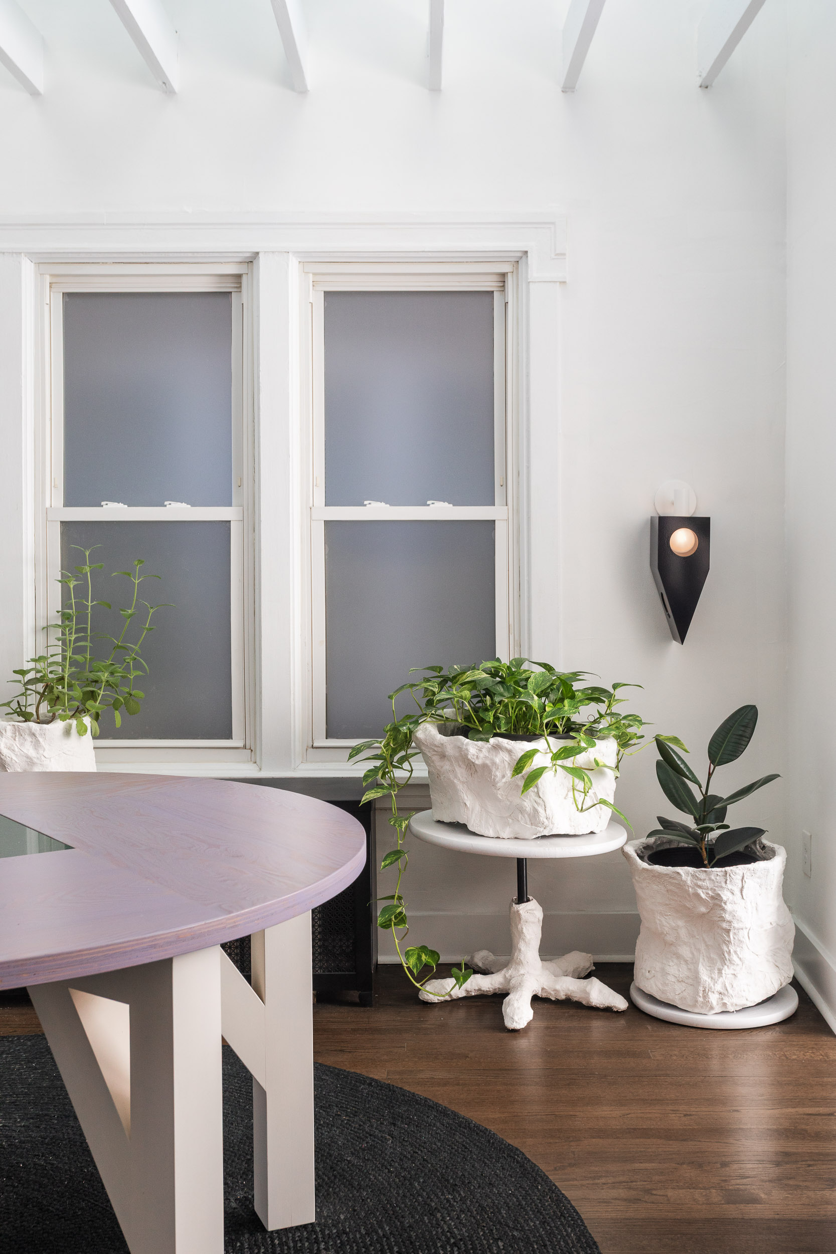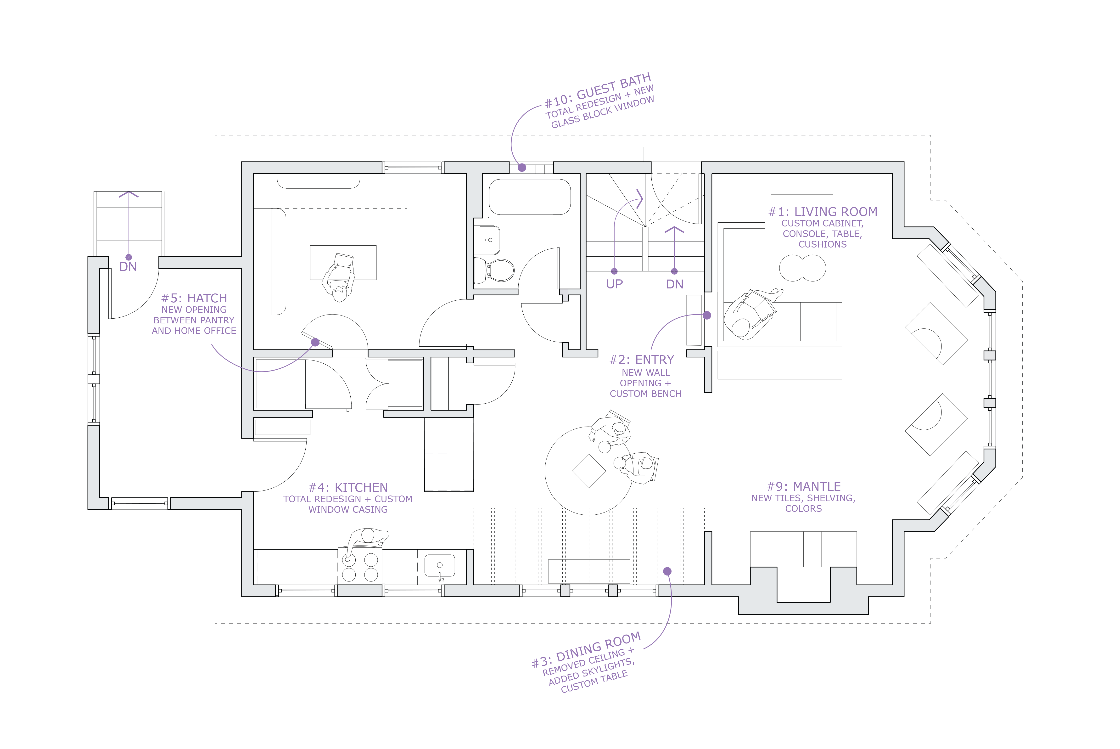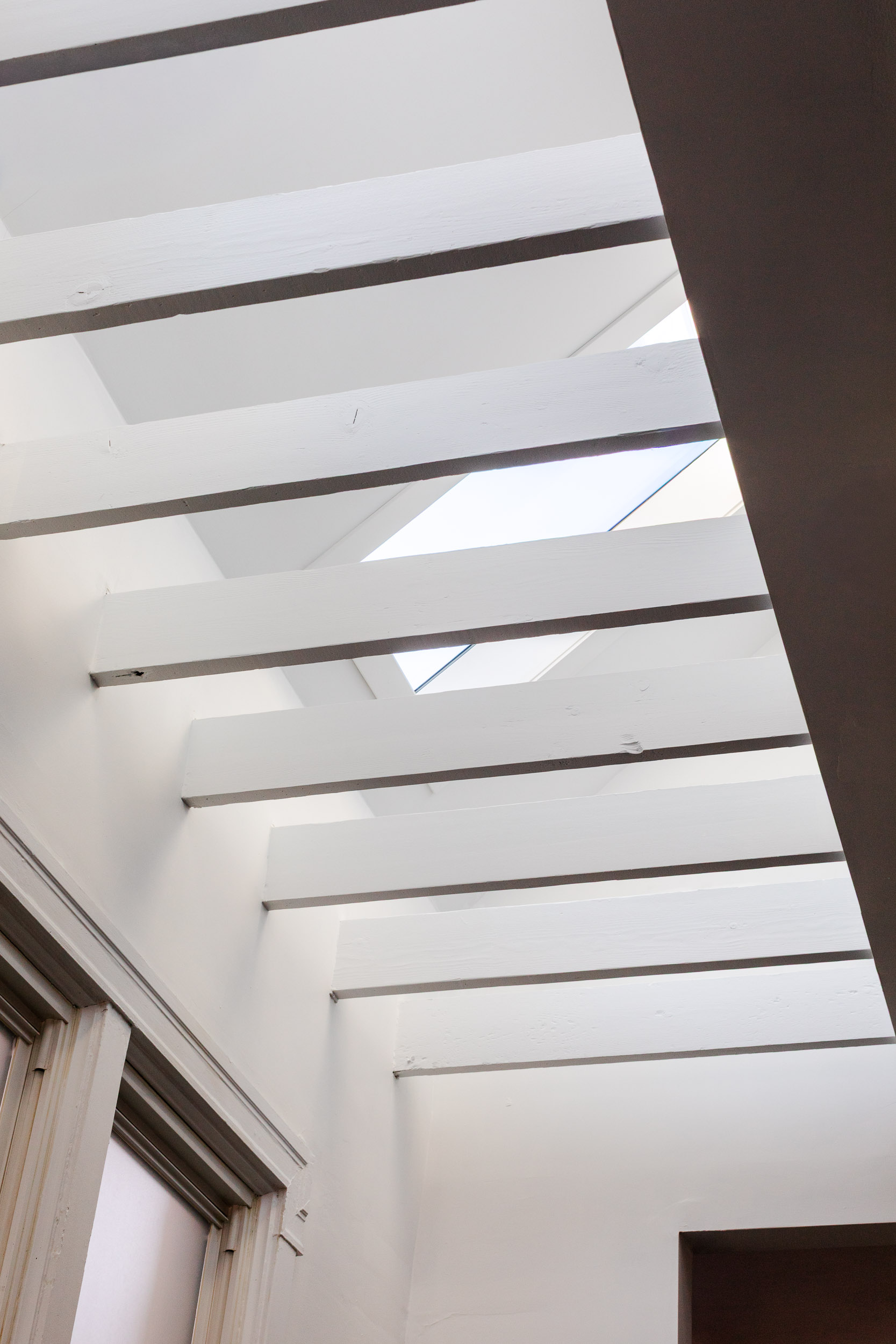 Two new skylights brighten the dining room; a portion of unfinished attic above was removed, but joists remain (both for structural necessity and to create new rhythms of light and shadow). The dining table, custom designed by Orders and fabricated by Jason Lewis Furniture, comfortably seats six. The marine-grade plywood top is durable and richly textured. The south wall features sconce surrounds designed by NO OFFICE - one of three small custom designs by friends which give the project a collaborative spirit.