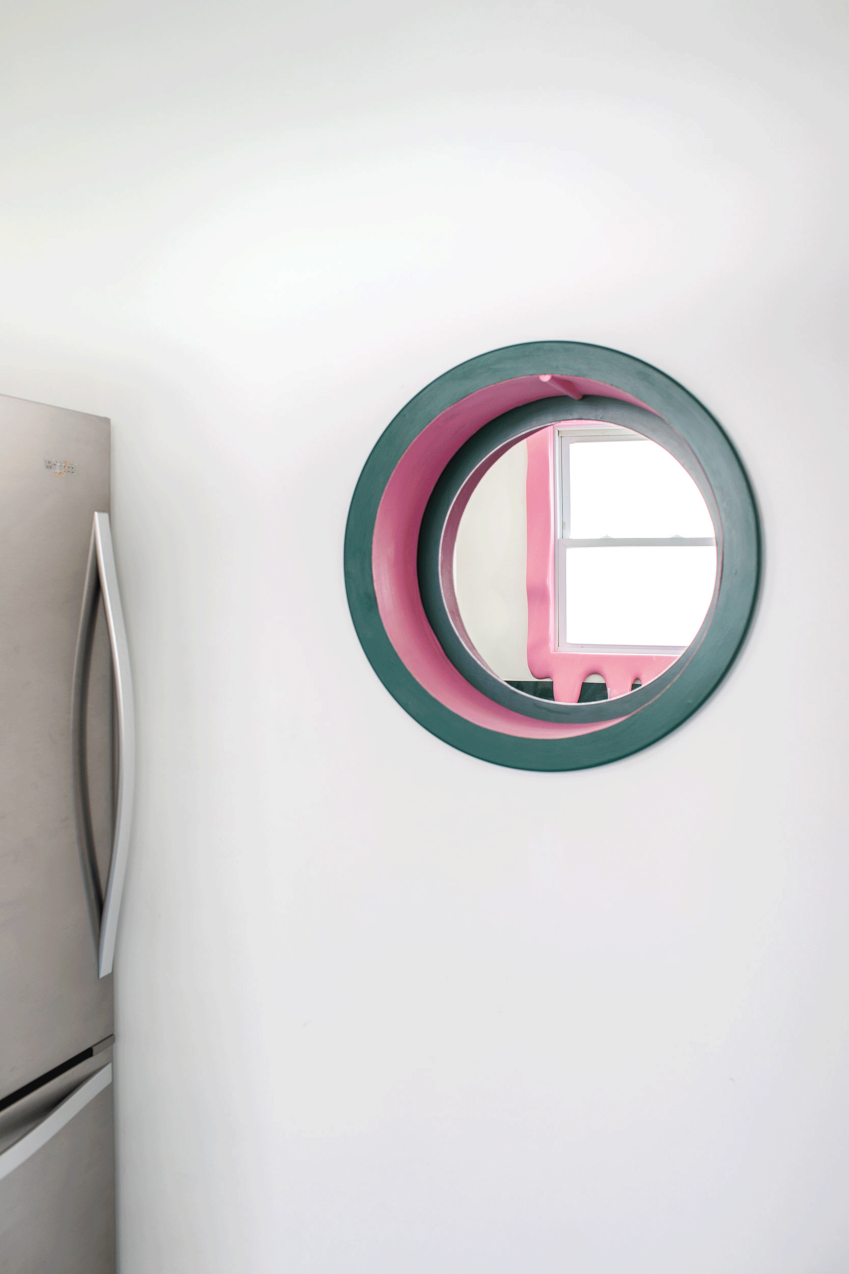 A new circular portal connects the kitchen and office / guest room. When open, this brings natural light into the room - and allows easy access to the fridge! When closed, it serves as a clock on one side, mirror on the other. The room also features a murphy bed which doubles as shelving when stowed.