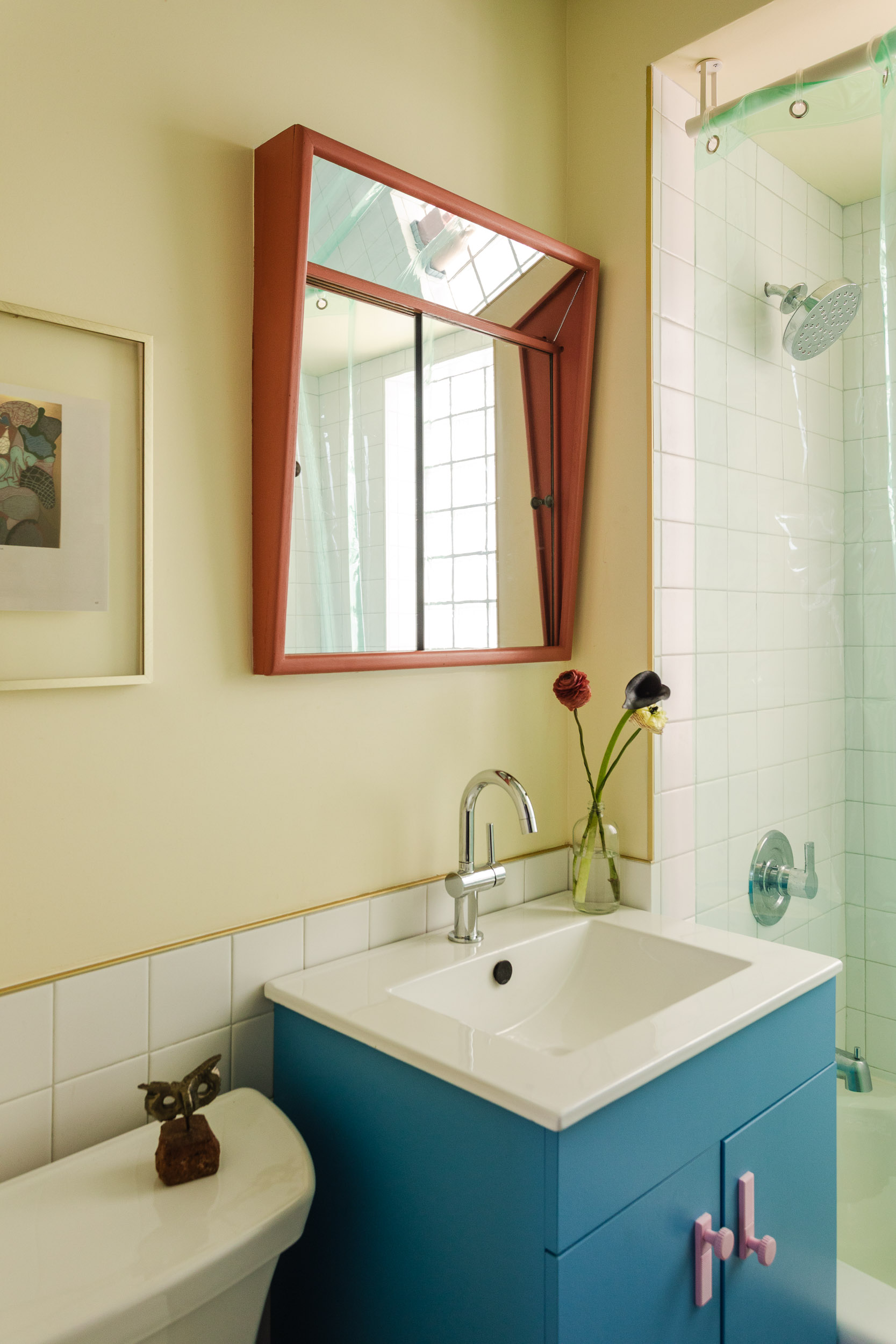 The primary bathroom required a complete overhaul. It is also a very tight space, and required careful planning. A new rounded sink eases tight corners. Matte black plumbing fixtures, teal tile, and beige and yellow accents all pick up on a palette from the paintings of Roger Brown. Despite the room’s tight footprint, a deep tub and clever storage solutions make it comfortable and functional.