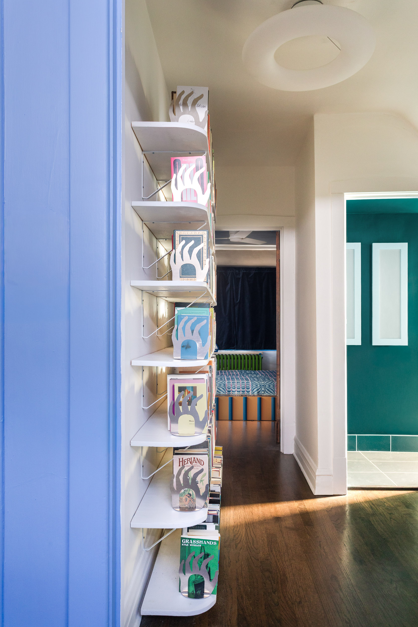 The bedroom features two new sconces and a platform bed designed and built by Orders, all in a color palette borrowed from Ray Yoshida. The creation of dining room skylights – which necessitated removal of attic space – also presented the possibility for an expanded bedroom closet. The previous reach-in closet is now a full walk-in. Just outside the bedroom, generous book shelves features custom bookends by Kristina Eldrenkamp, inspired by the work of Christina Ramberg.