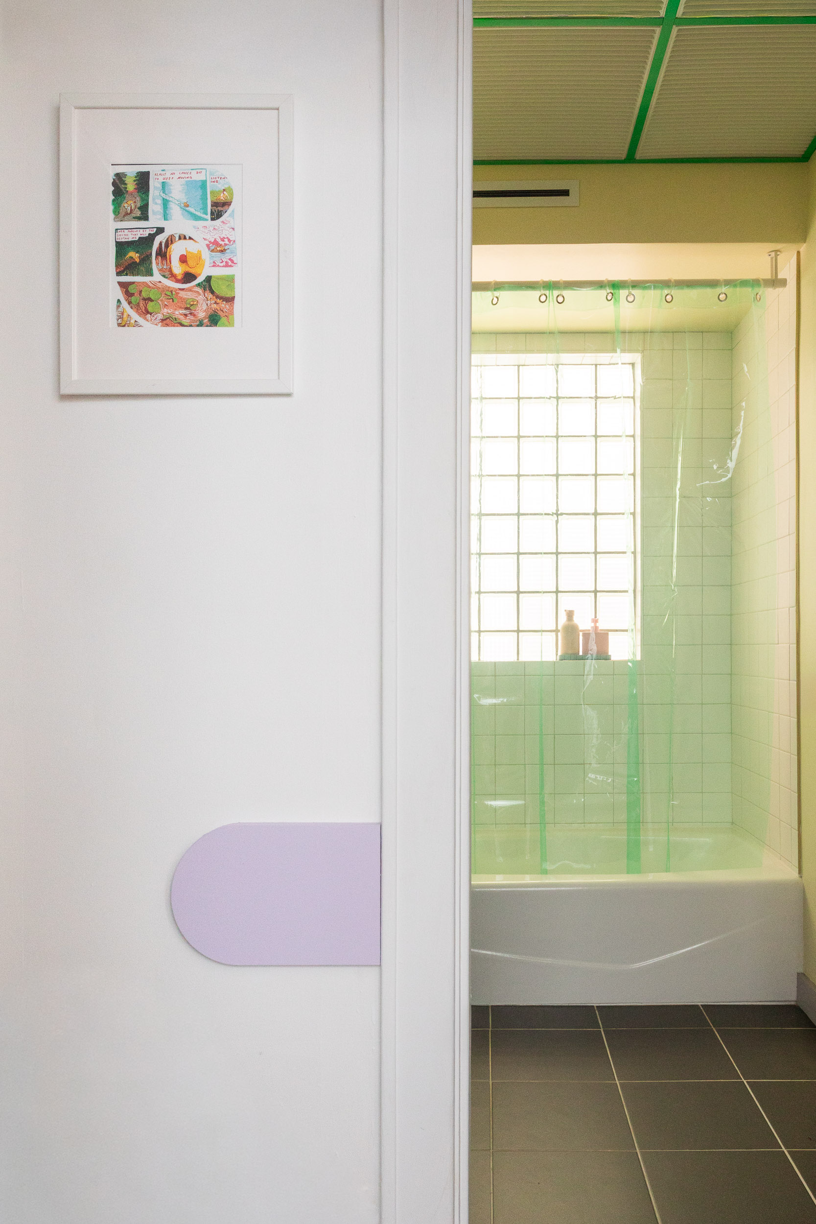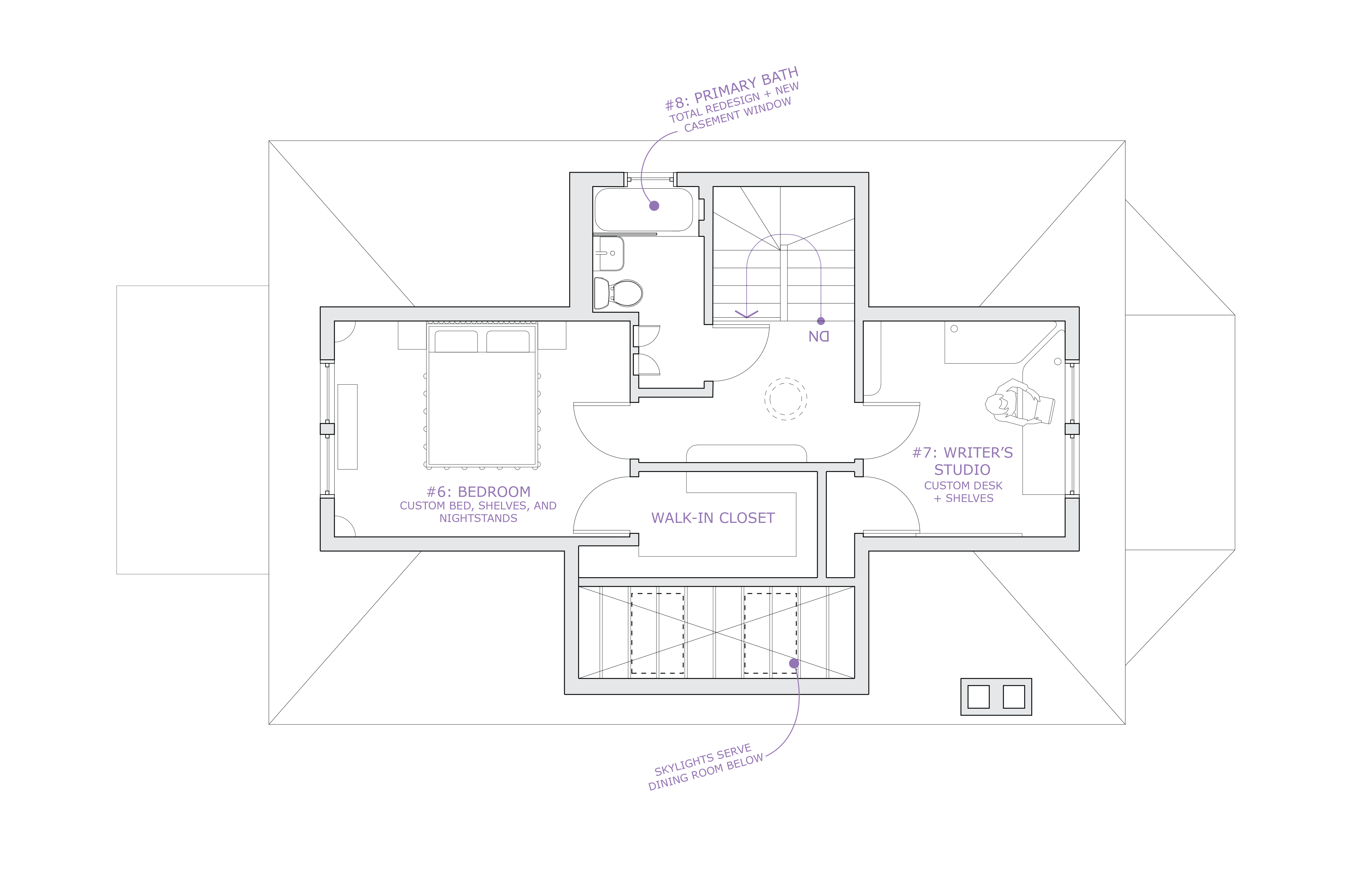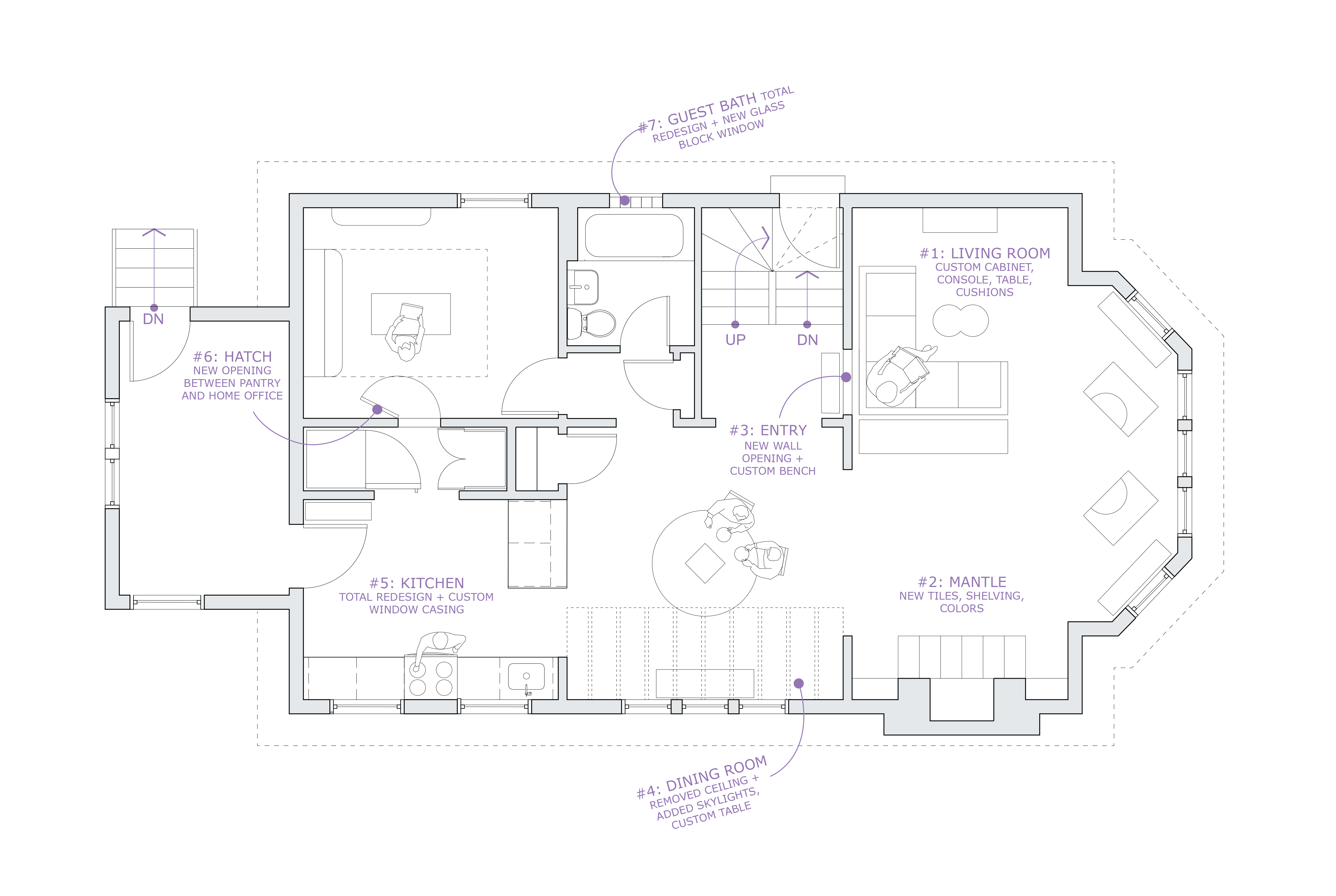 The guest bath is updated for functionality - new fixtures, mechanical ventilation, and all new finishes. Simultaneously, it was an opportunity for play of color and pattern, taking cues from paintings by Barbara Rossi. Due to a quirk of the home’s 1928 construction, the bathroom wall is built with framing “on flat”, or turned sideways. A custom purple cap is required to make room for a recessed paper holder. The drop ceiling glows with unique fluted panels and custom painted T-bar.